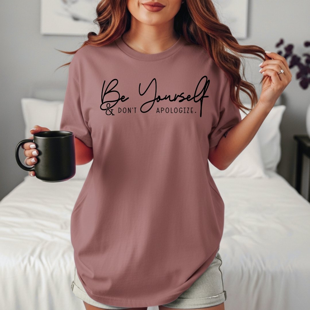 Celebrate your authenticity with a shirt that speaks your truth. This "Be Yourself & Don't Apologize" t-shirt features a striking black hand-lettered script on a beautiful mauve-colored backdrop. Printed on the premium Bella + Canvas 3001, this shirt feels like a well-loved favorite from the very first wear.